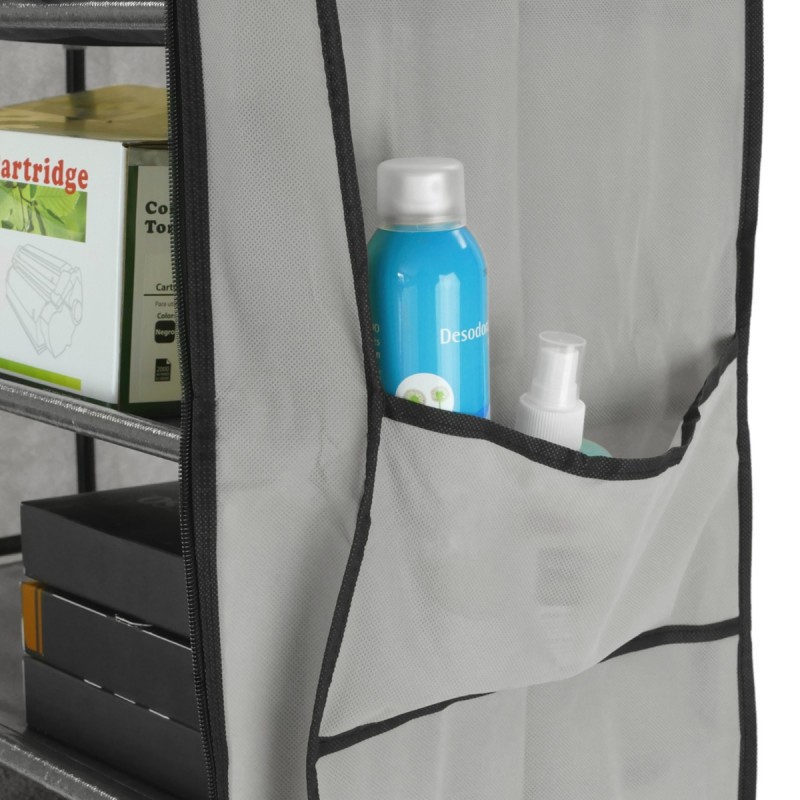 Especificaciones- Armario con estanterías, guardatodo de bajo coste, basado en estructura de tubo metálico y cubierta de tela de alta resistencia.