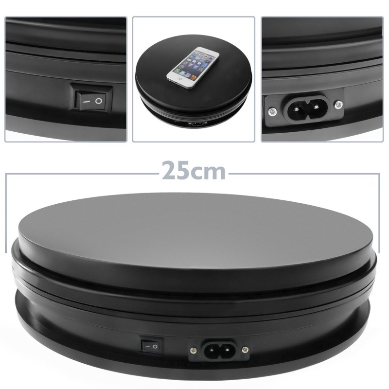 Base giratoria motorizada. Se trata de una plataforma que gira lentamente y de forma sostenida, al ser activada. Se conecta a la red eléctrica. Ideal para fotografía de modelos fotográficos, realización de modelos 3D, exposiciones, escaparates, publicidad, etc.